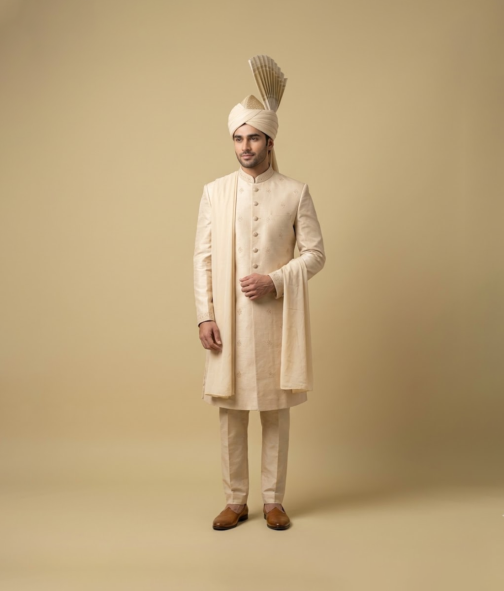 Designed in soft beige with gold dust accents, this classic Aitchison kulla adds subtle shimmer to any outfit. The traditional cut provides comfort while maintaining a polished, structured look. Ideal for weddings, formal events, or festive celebrations, it pairs perfectly with light-toned sherwanis or kurta sets. Its neutral yet decorative design makes it a versatile accessory for men who want a traditional headpiece with a refined, stylish touch.