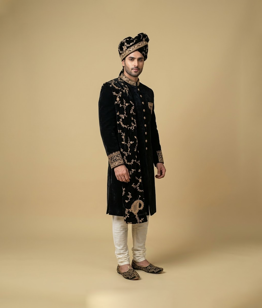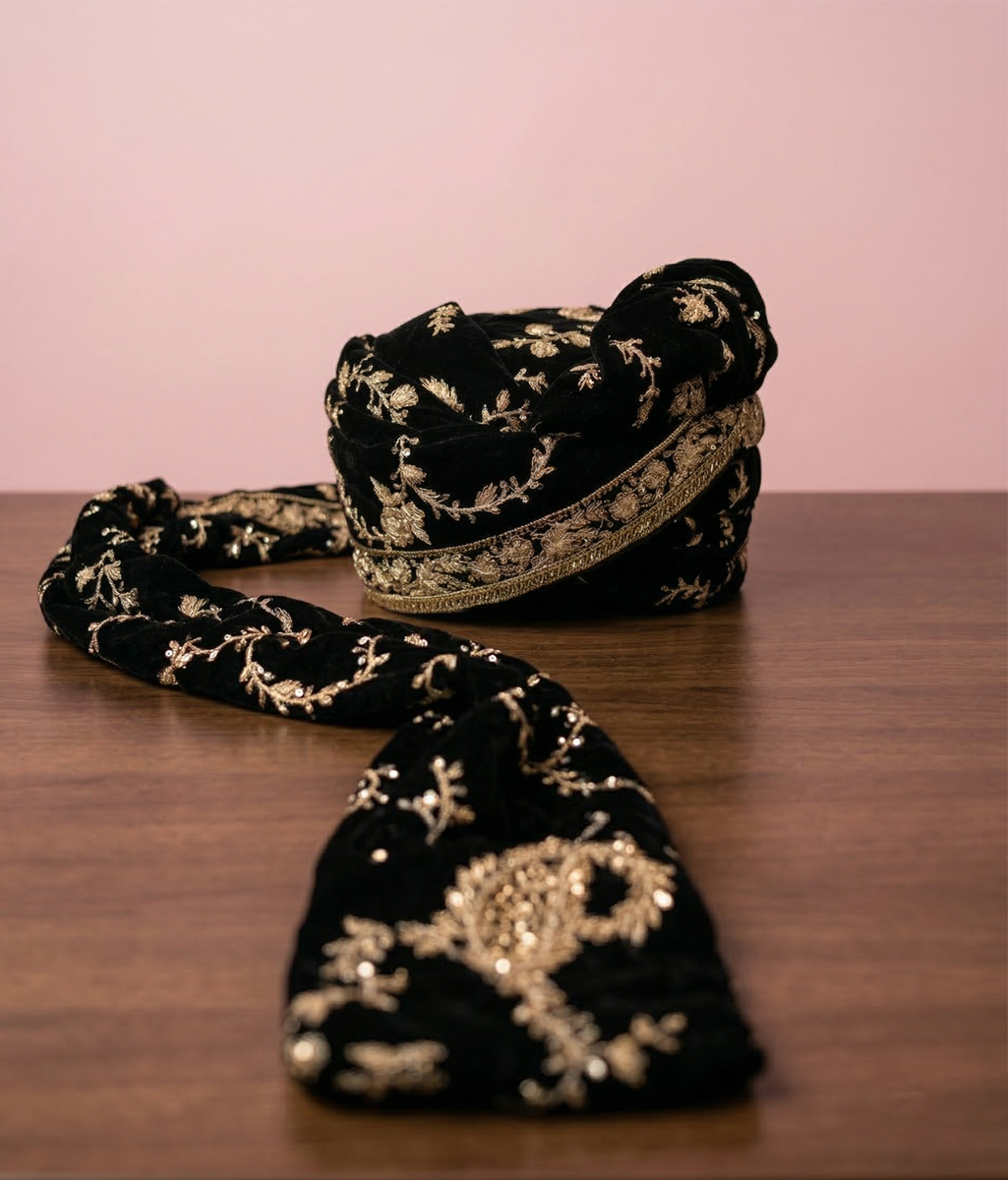 This black turban features detailed gold embroidery, creating a striking contrast and a polished, regal look. Its classic cut ensures comfort while keeping a structured fit on the head. Ideal for weddings, festive events, or formal occasions, it pairs perfectly with black or gold-accented sherwanis. The intricate embroidery adds style and sophistication, making it a standout accessory for men who want traditional headwear with a decorative, elegant touch.