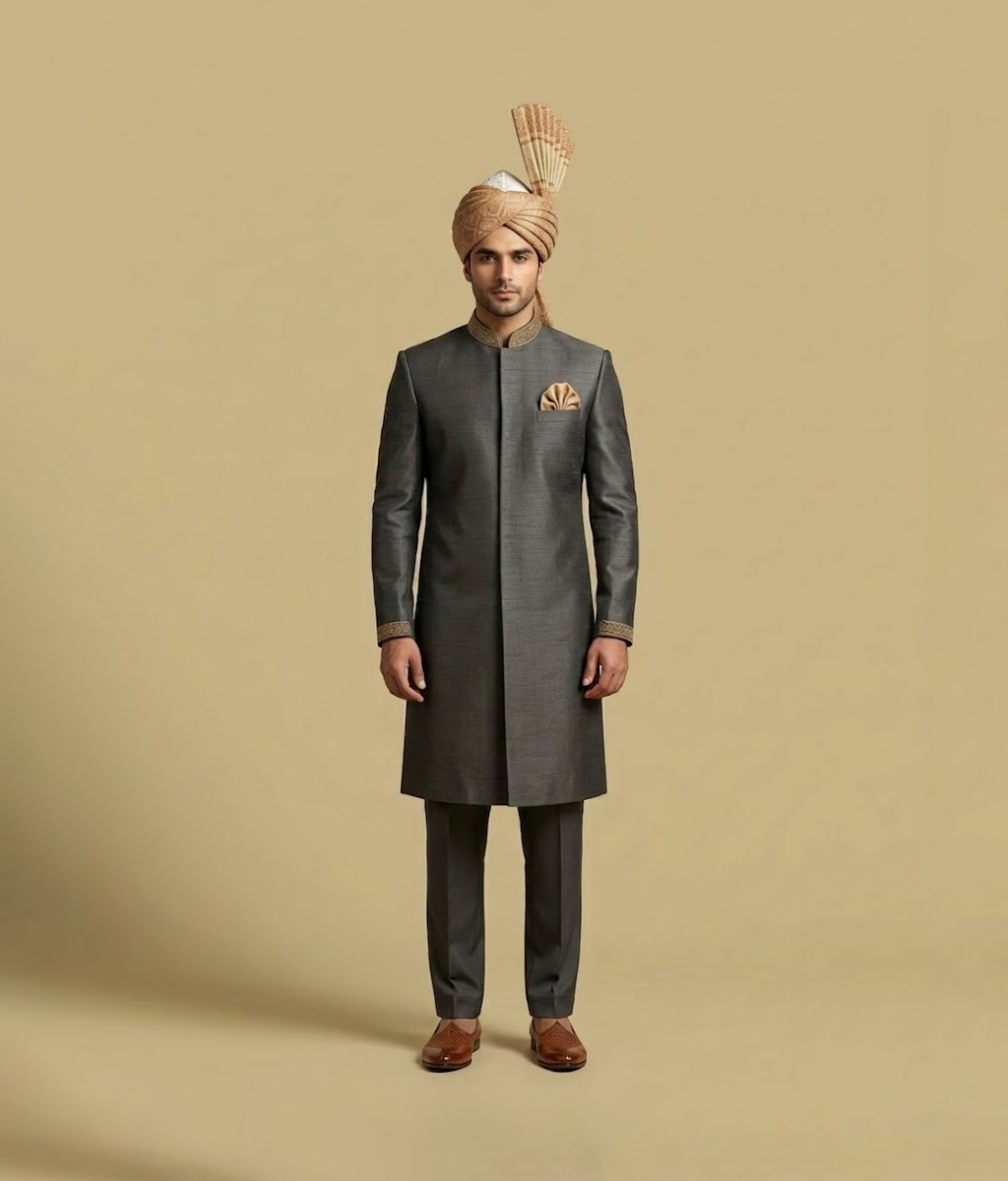 A brown gold classic kulla designed with soft gold detailing that enhances its rich traditional look. The structured form ensures a comfortable fit while keeping its shape throughout long events. Ideal for weddings, festive occasions, and formal gatherings, it blends easily with cream, beige, or darker sherwanis. The gold accents add a warm, elegant finish without making the design too heavy, making it a timeless choice for refined dressing.