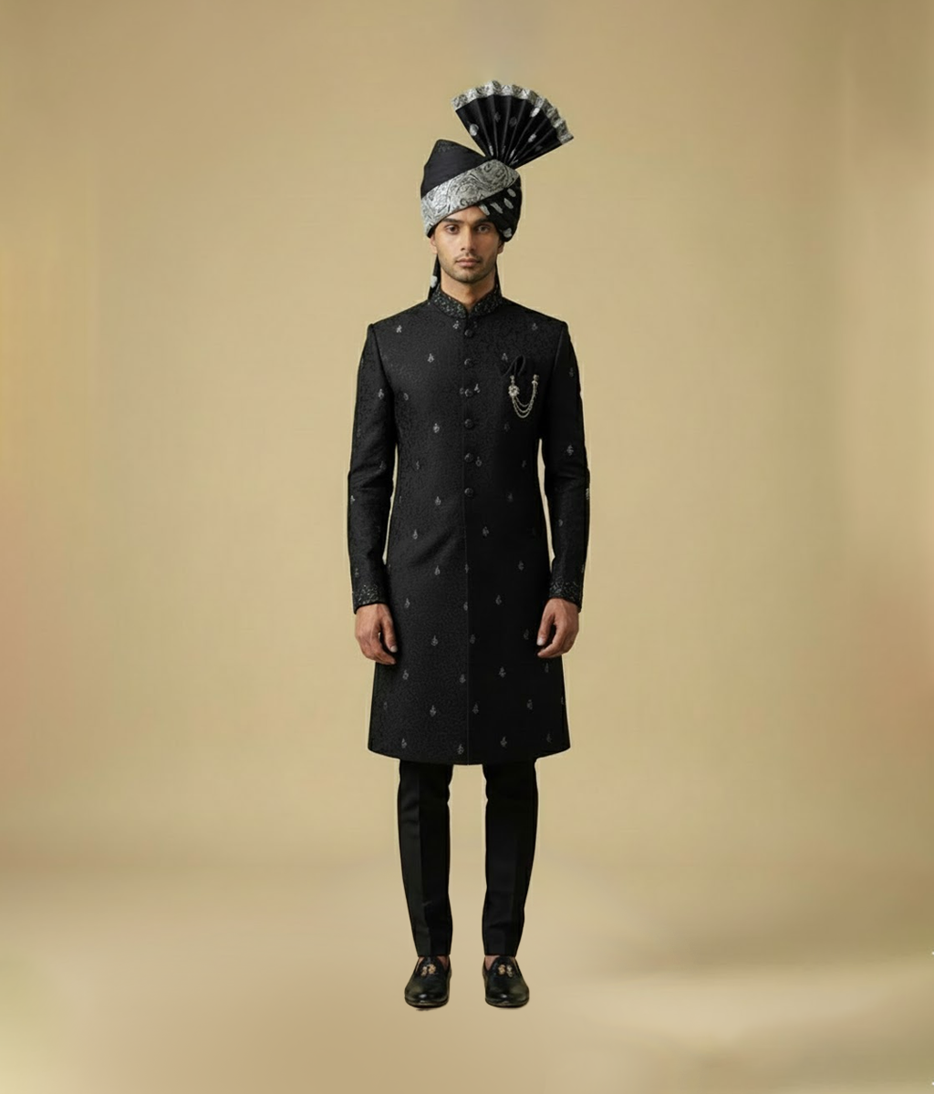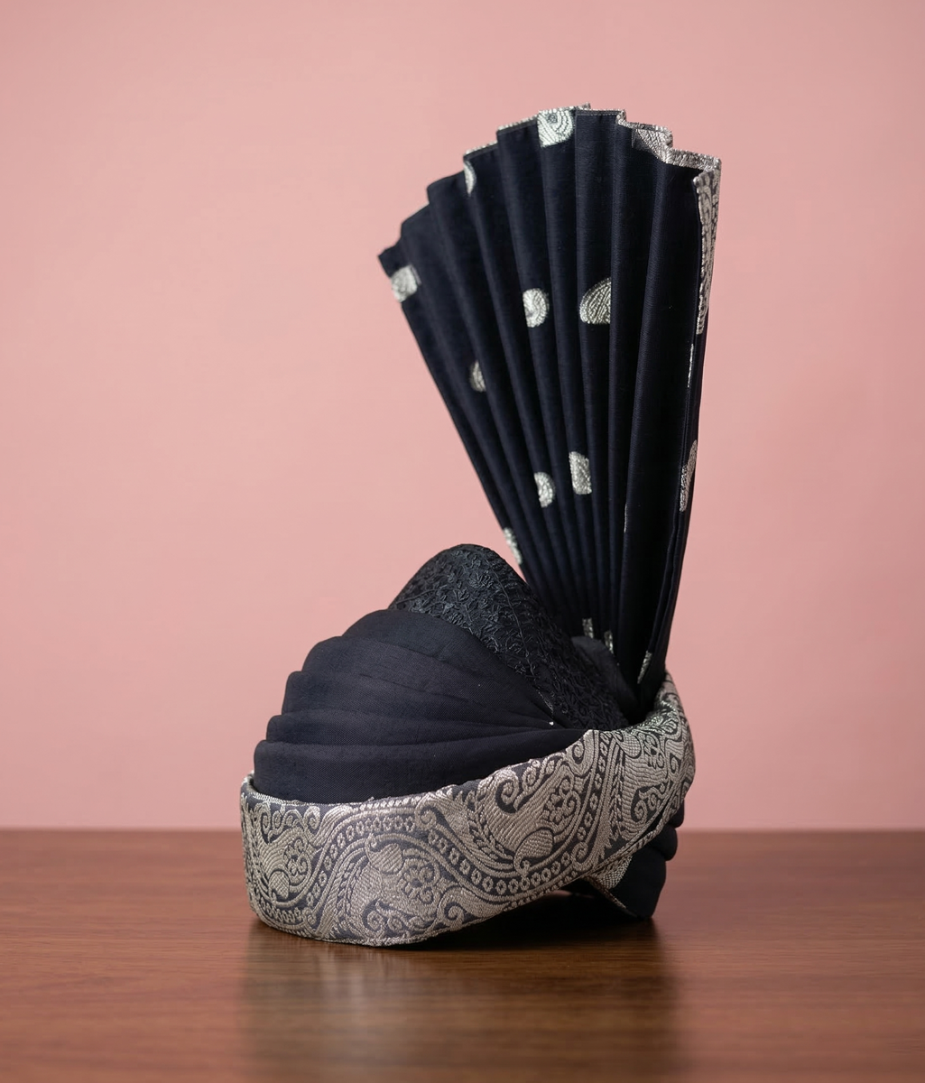 An imperial black gold kulla with strong black base and refined gold accents that create a premium traditional look. The design is bold but balanced, offering elegance without being overwhelming. Its firm structure keeps it comfortable for extended wear. Ideal for formal weddings and cultural events, it pairs perfectly with dark sherwanis for a powerful and classy appearance.