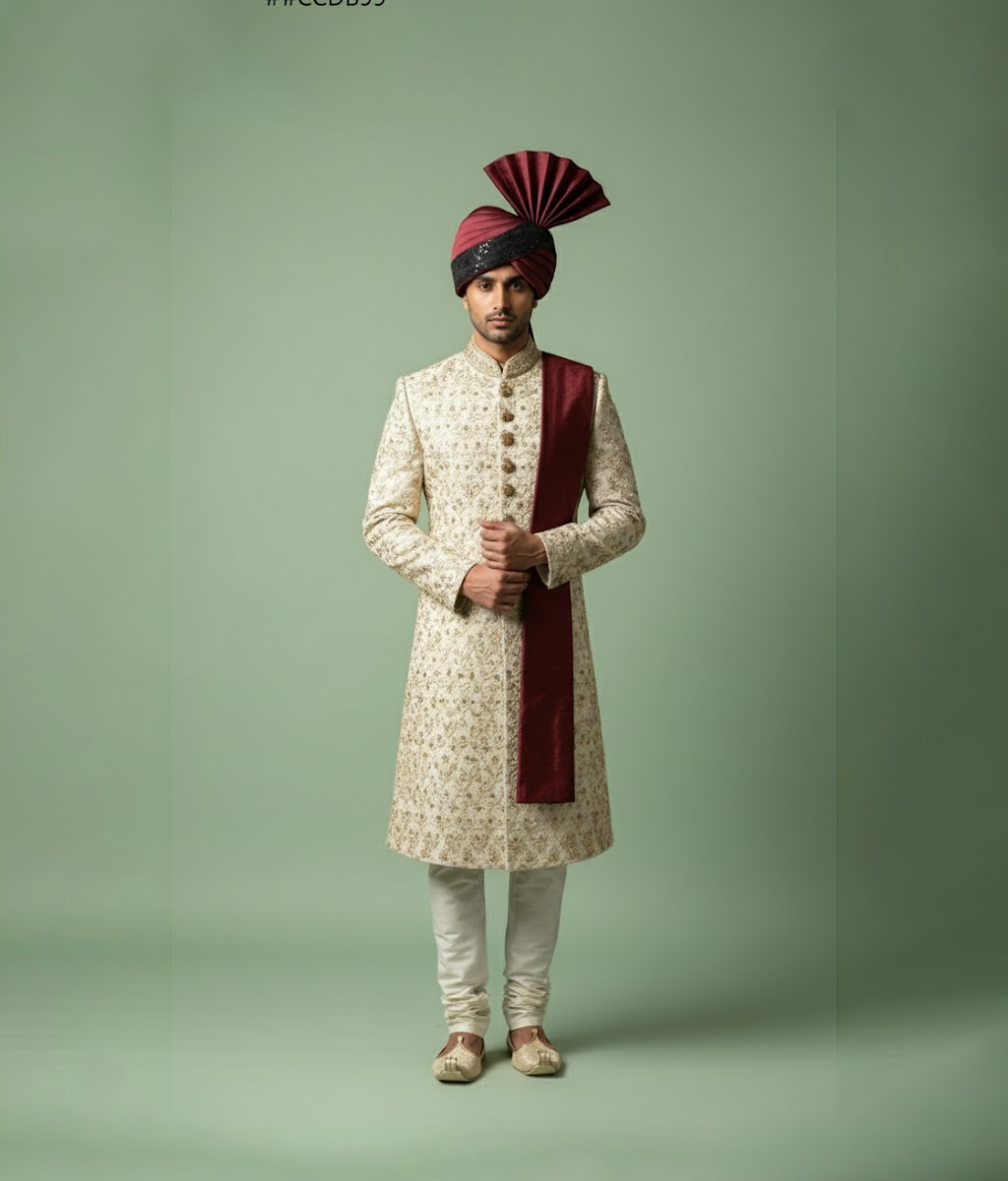 A maroon black contrast kulla designed with a bold mix of deep maroon and classic black tones. The contrast creates a strong traditional look while keeping it stylish and clean. Comfortable and well-structured, it holds its shape throughout long events. Perfect for weddings and festive gatherings, it pairs best with black or maroon sherwanis for a sharp coordinated look.